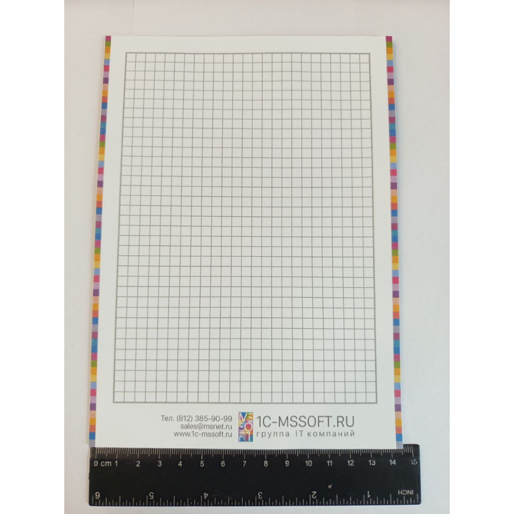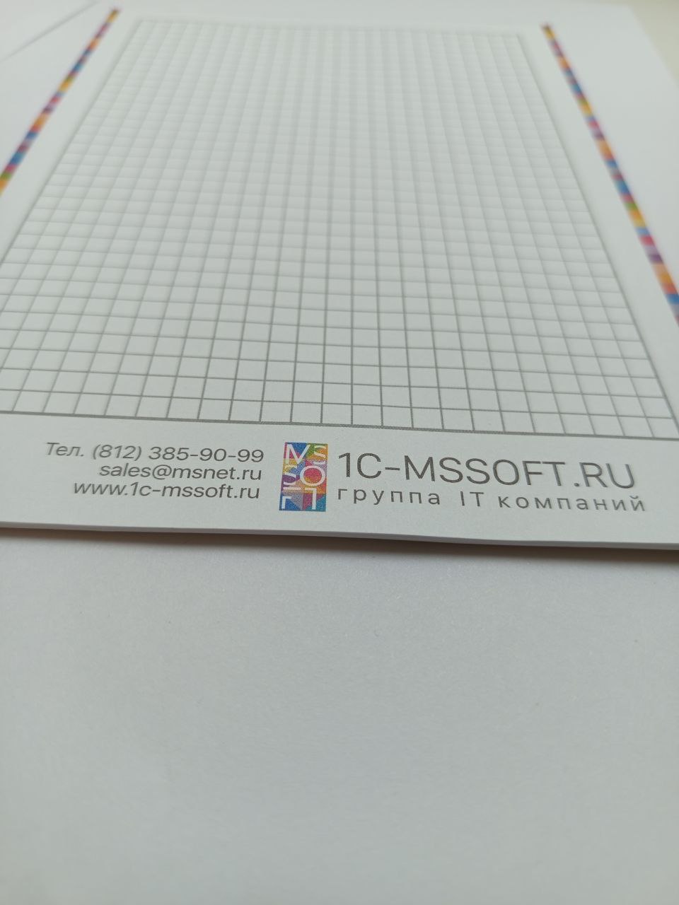 Блокнот с отрывными листами на картонной подложке. Одна сторона листа - в клетку, с окантовкой по бокам в фирменных цветах и логотипом 1С-Мссофт.ру внизу страницы. Оборотная сторона - белая.